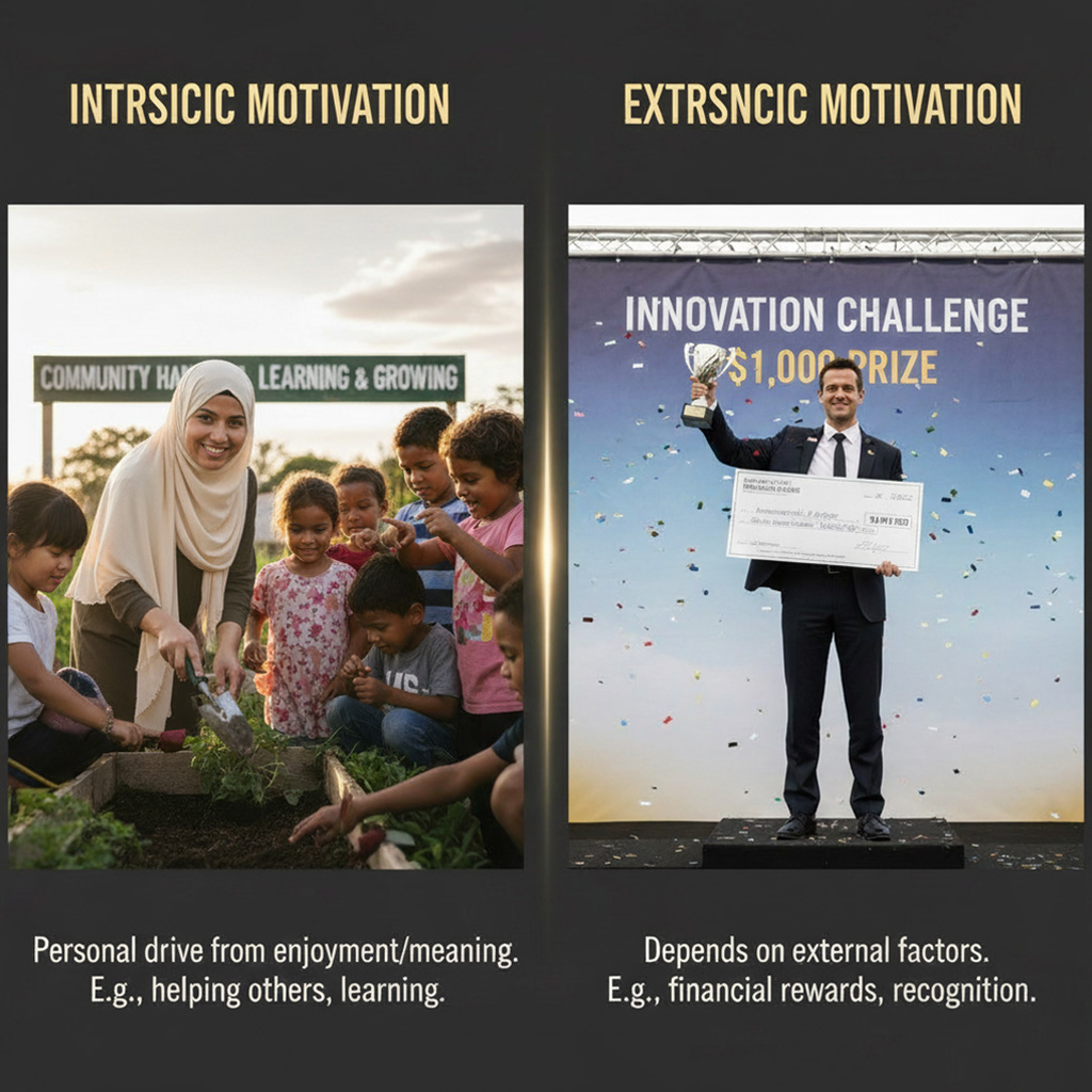 انگیزهی مشارکت افراد از دو منبع اصلی نشأت میگیرد: انگیزش درونی (عامل احساسی و شخصی) و انگیزش بیرونی (مشوقها و پاداشهای محیطی). انگیزش درونی هنگامی رخ میدهد که افراد کاری را صرفاً بهدلیل جذابیت، لذت یا احساس مفیدبودن آن انجام میدهند؛ مانند حس مسئولیت اجتماعی، یادگیری و پیشرفت شخصی. در مقابل، انگیزش بیرونی زمانی فعال میشود که افراد بهدنبال پاداشهای خارجی مانند پول، امتیاز، مقام یا تقدیرهای جمعی فعالیت میکنند. مطالعات روانشناسی نشان میدهد که «انگیزه درونی بیشتر بر رشد شخصی، احساس وظیفهشناسی و شناخت هدف متمرکز است، در حالی که انگیزه بیرونی شامل مشوقهای مالی، مقام و پذیرش اجتماعی است.
